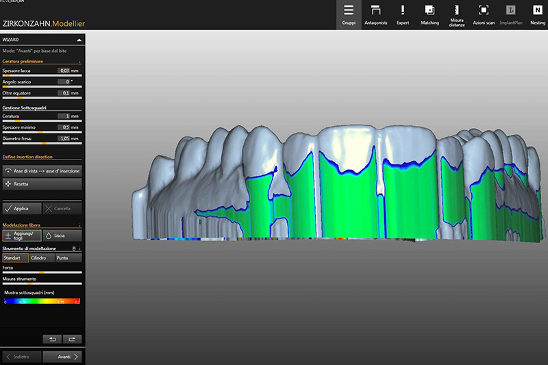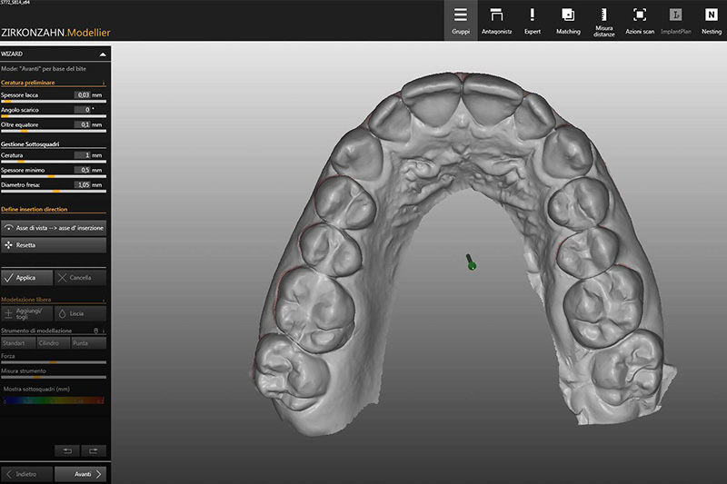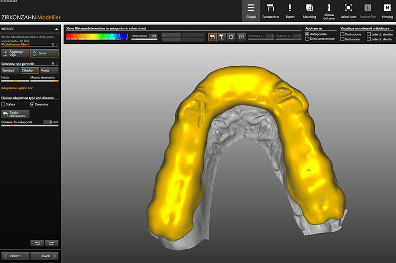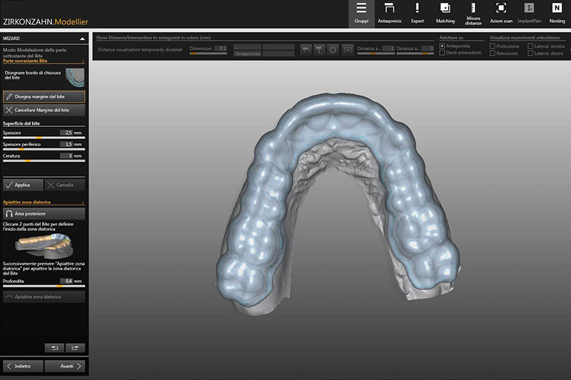 I bite vengono disegnati attraverso l’uso del software, considerando attentamente i movimenti di protusione e lateralità. La ritenzione viene regolata in base ai sottosquadri presenti nel modello.